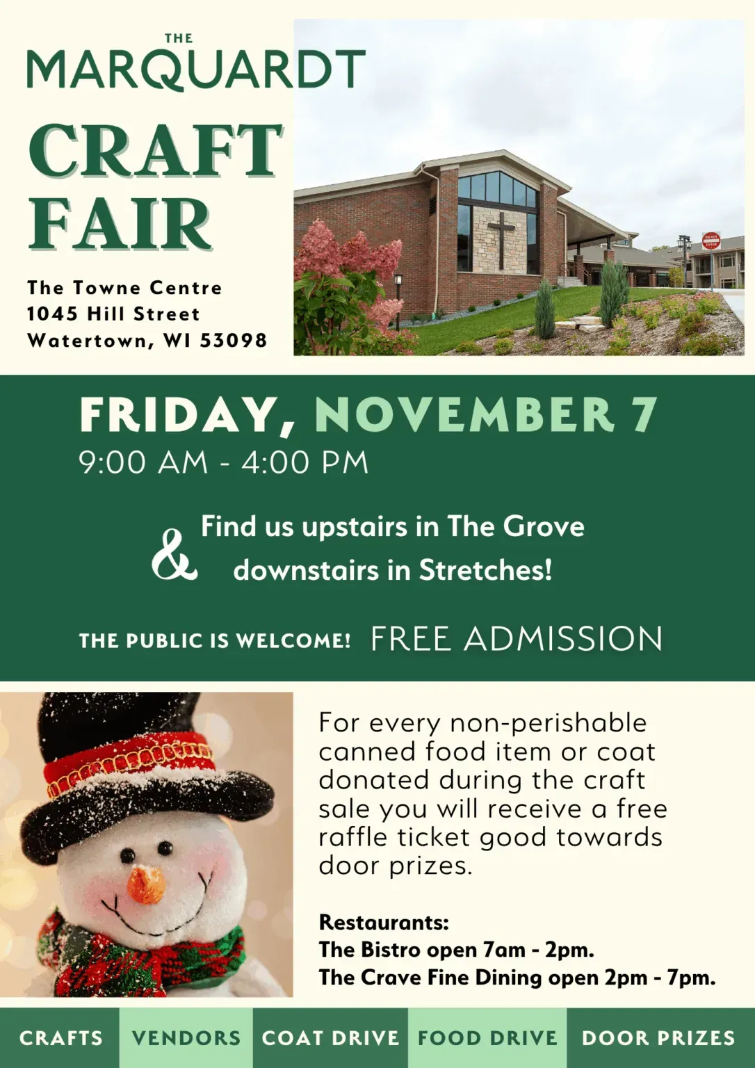 Join us for the annual Craft Fair at The Marquardt on Friday, November 7th from 9am-4pm! Free admission, door prizes, restaurants open for lunch, and of course, crafts! Bring non-perishable food items and/or coat donations in exchange for free raffle tickets towards the door prizes. See you there!